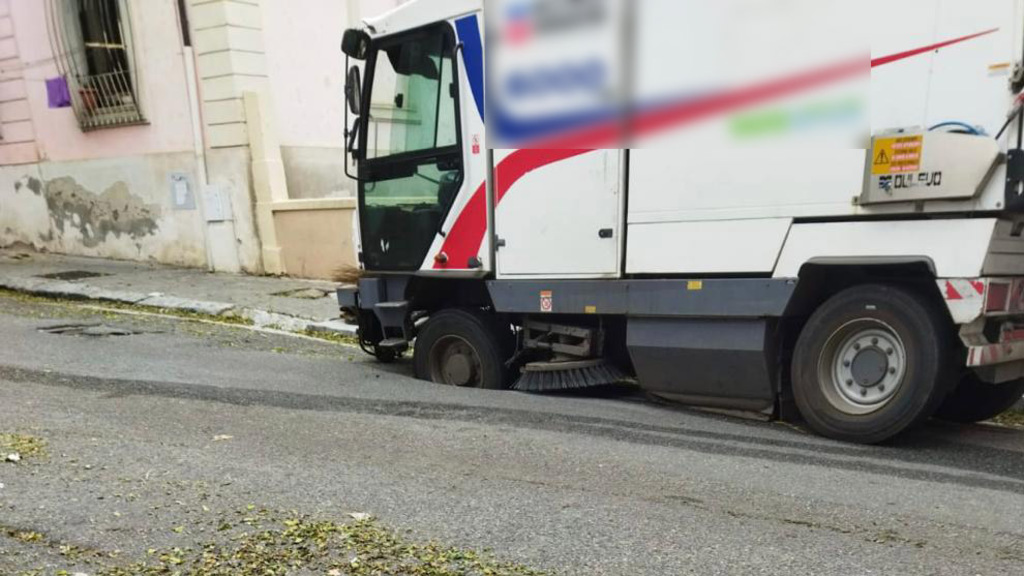 Un camioncino per lo spazzamento delle strade è rimasto bloccato mentre era in servizio questa mattina nella zona di Tremulini per il cedimento dell'asfalto che gli ha bloccato la gomma anteriore sinistra. Dopo qualche minuto, l'intervento di un carro attrezzi che ha liberato il mezzo.