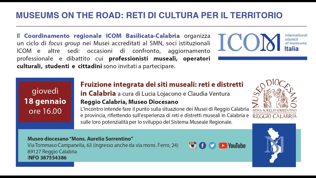 Giovedì 18 gennaio h 16 presso il Museo diocesano di Reggio Calabria si svolgerà il primo degli incontri dedicato al tema “Fruizione integrata dei siti museali: reti e distretti in Calabria” a cura delle consigliere Lucia Lojacono e Claudia Ventura.