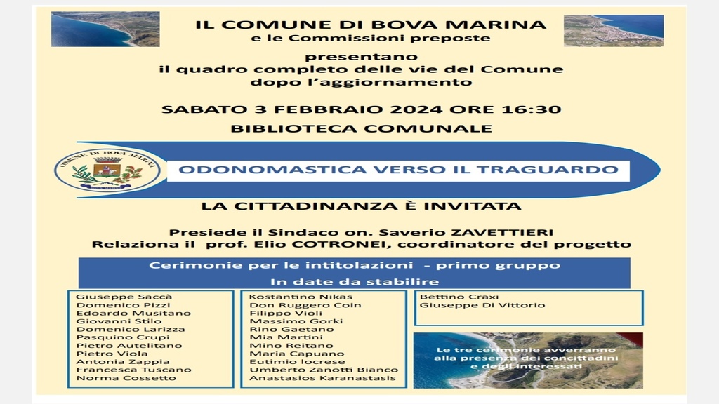 Presentazione del quadro completo delle vie comunali di Bova Marina dopo l’aggiornamento. E’ programmato per domani pomeriggio alle ore 16,30 presso la Biblioteca comunale, l’incontro “Odonomastica verso il traguardo” presieduto dal primo cittadino Saverio Zavettieri e dal professore e coordinatore del progetto Elio Cotronei.