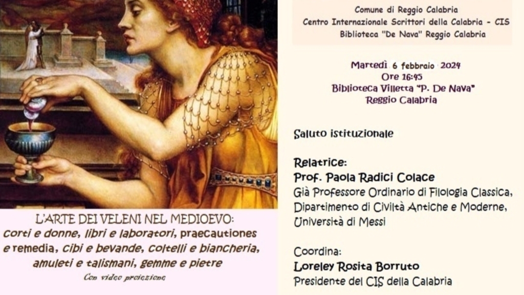 Promossa dal Centro Internazionale Scrittori della Calabria, con il patrocinio del comune di Reggio Calabria, martedì 6 febbraio 2024, alle ore 16:45, presso la Biblioteca Villetta “De Nava” di Reggio Calabria si svolgerà la conferenza “L’arte dei veleni nel Medioevo”. Corti e donne, libri e laboratori, praecautiones e remedia, cibi e bevande, coltelli e biancheria, amuleti e talismani, gemme e pietre. Dopo il saluto istituzionale, coordina la manifestazione Loreley Rosita Borruto, presidente del Cis della Calabria. Con il supporto di slides relaziona Paola Radici Colace, già Prof. Ordinario di Filologia classica, dell’Università di Messina, presidente onorario e direttore scientifico del Cis della Calabria. Nel Medioevo l’avvelenamento veniva utilizzato, come arma segreta, per raggiungere obiettivi personali o politici. L’arte del veleno, oscura e subdola, nell’antichità ha influenzato non solo la politica e la società ma anche il mondo dell’arte e della letteratura.