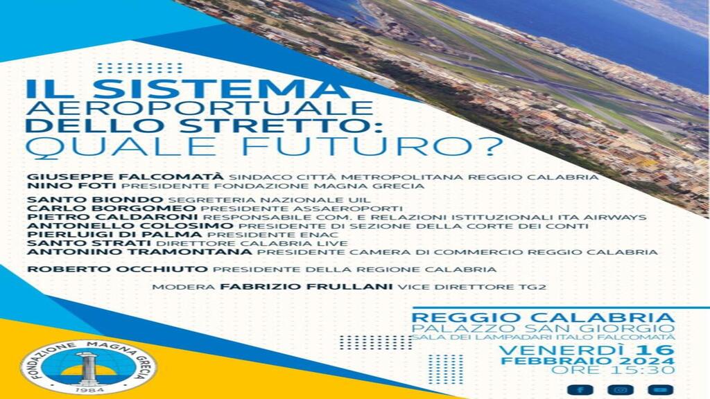 Si incentra sul tema del futuro del sistema aeroportuale dello Stretto il convegno organizzato dalla Fondazione Magna Grecia in programma a Reggio Calabria venerdì 16 febbraio a partire dalle 15.30 a Palazzo San Giorgio (Sala dei lampadari Italo Falcomatà).