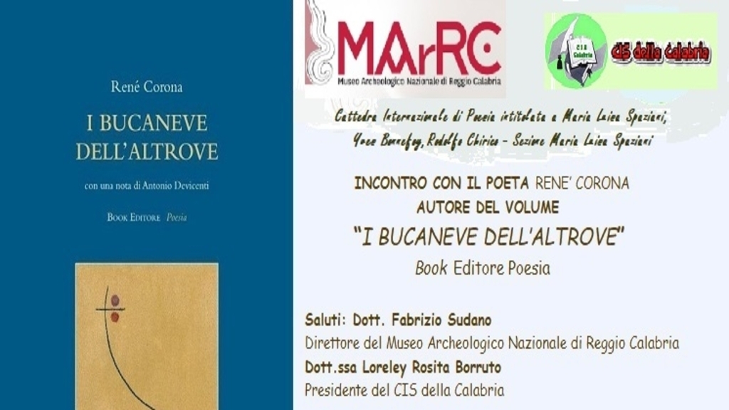 Nell’ambito della Cattedra Internazionale di Poesia del CIS della Calabria intitolata a Maria Luisa Spaziani, Yves Bonnefoy e Rodolfo Chirico, venerdi 23 febbraio 2024, alle ore 17:00, il Centro Internazionale Scrittori della Calabria e il Museo Archeologico Nazionale di Reggio Calabria, nella Sala conferenze del Museo promuovono l’incontro con Renè Corona, autore del volume I bucaneve dell’altrove”, Book Editore Poesia. Introducono Fabrizio Sudano, direttore del MArRC, e Loreley Rosita Borruto, presidente del Cis della Calabria. Relaziona Paola Radici Colace, già professore ordinario di Filologia Classica, Dipartimento di Civiltà Antiche e Moderne, Università di Messina, presidente onorario, direttore scientifico e responsabile della Cattedra di Poesia Internazionale del CIS intestata a Maria Luisa Spaziani. Segue l’intervento programmato di Maria Rosaria Gioffrè, docente di Lingua e Cultura francese. Concluderà l’autore Renè Corona, già docente di Lingua e Traduzione Francese, Università di Messina, componente del Comitato Scientifico del CIS. Nella prefazione al volume “I bucaneve dell’altrove” il prefatore Antonio Devicienti sottolinea che “uno dei pregi della poesia di Corona sta proprio nell’accogliere e dare dignità poetica a oggetti, parole e immagini tradizionalmente marginali. Ne risulta un vastissimo ampliamento del repertorio poetico. Lo si vede soprattutto con le presenze femminili che popolano questa raccolta: sono le dedicatarie o le scrittrici citate, donne patinate o comuni, chiromanti che leggono il destino; donne che ci osservano da quadri o dal chiuso di un libro, incontrate per caso nel grigiore quotidiano o lungamente amate; donne catturate in un solo gesto, concentrate in un particolare oppure vive nella loro interezza; donne sensuali che promettono la gioia dell’erotismo … La ricchezza lessicale di Corona deriva dalla conoscenza e dal profondo amore dell’autore per la lingua italiana in tutte le sue sfumature”.