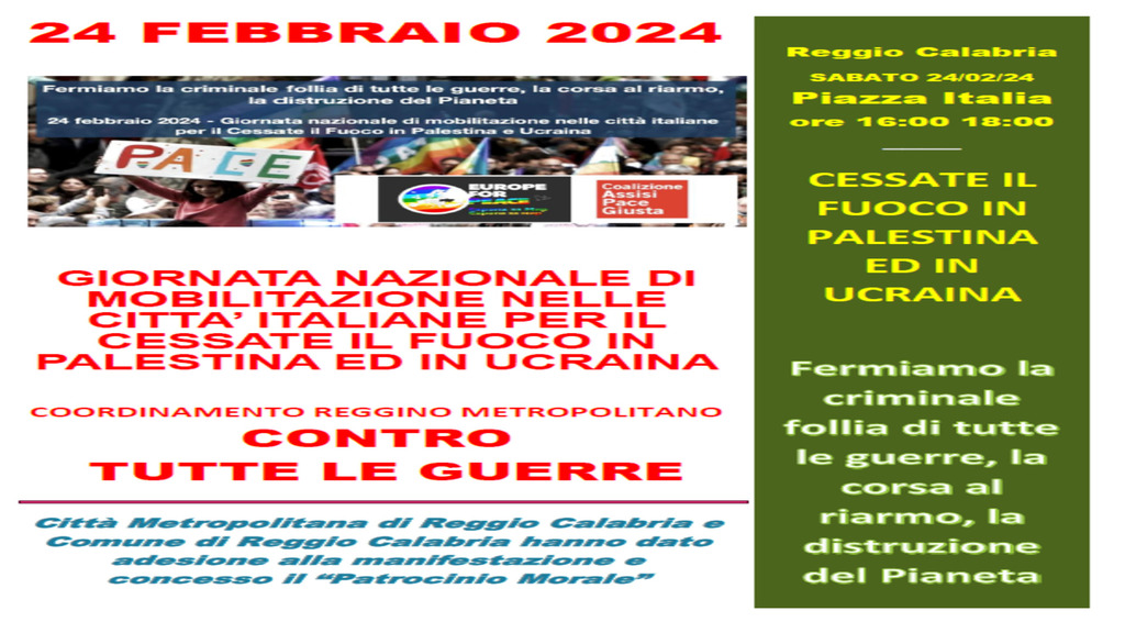 Sabato 24 febbraio a Reggio Calabria è stata programmata dal Coordinamento reggino metropolitano contro tutte le guerre una manifestazione correlata alla Giornata di Mobilitazione Nazionale indetta dalle più importanti associazioni pacifiste del nostro paese.