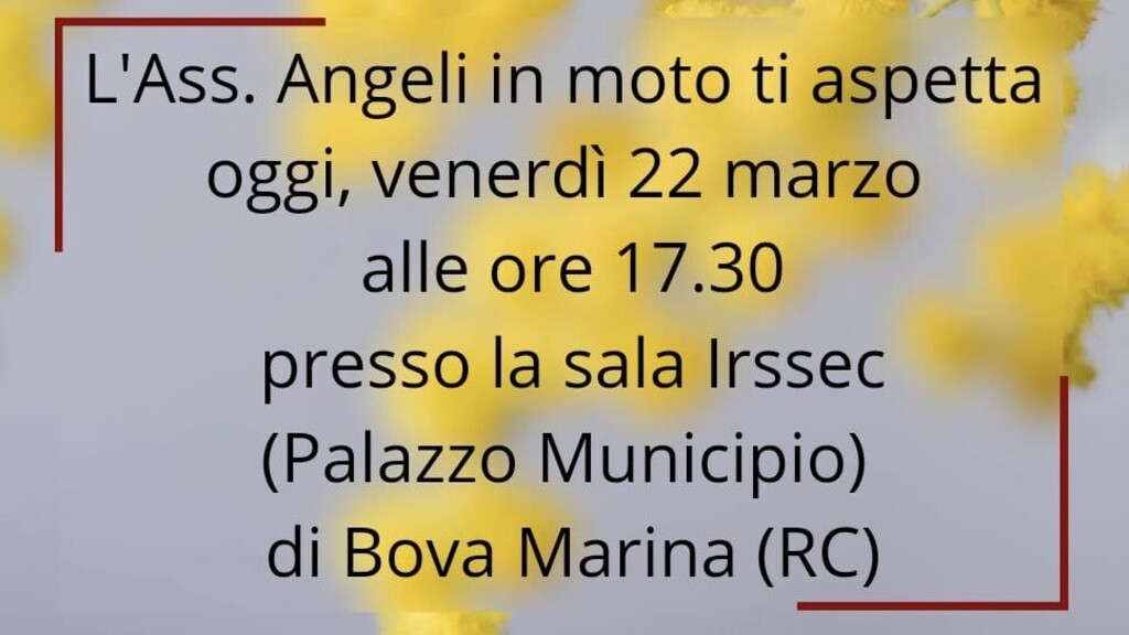 Si terrà oggi alle 17:30 presso la sala Irssec del Palazzo Municipio di Bova Marina la nuova tappa della motostaffetta organizzata dall’Associazione Angeli in moto contro la violenza sulle donne. L’evento che vede anche la partecipazione del Comune di Bova Marina.