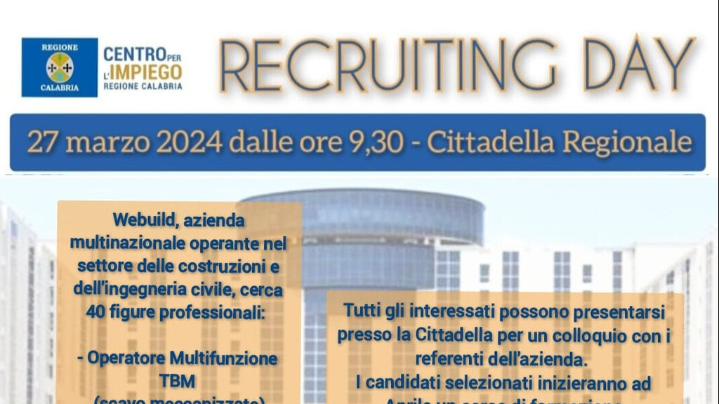 Mercoledì 27 marzo, dalle ore 9:30, organizzato dal Dipartimento al lavoro, si terrà, alla Cittadella regionale, un “Recruiting day” dell’azienda Webuild (www.webuildgroup.com). L’iniziativa è stata avviata in seguito a diversi dialoghi intrapresi dalla Giunta regionale con le aziende interessate a investire in Calabria. Pertanto, gli interessati, in base alle mansioni richieste dall’azienda, potranno recarsi presso la sede della Regione a Catanzaro dove l’azienda effettuerà il processo di reclutamento.