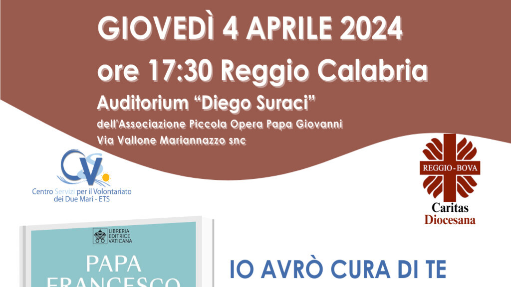 A partire dai molteplici spunti offerti dal volume "Io avrò cura di te. La chiamata per il bene comune", edito da Libreria Editrice Vaticana e Solferino, Centro Servizi per il Volontariato di Reggio Calabria e Caritas Diocesana di Reggio Cal.-Bova promuovono un incontro che potrà rappresentare una opportunità motivazionale preziosa per i volontari e per tutte le persone che hanno a cuore il bene comune.