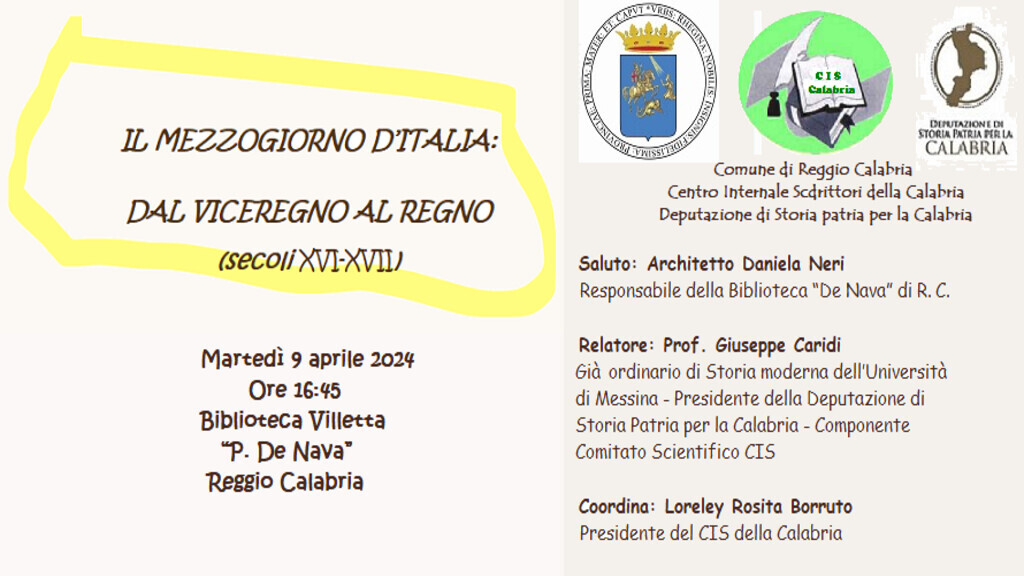 “Il Mezzogiorno d’Italia: dal Viceregno al Regno” è il titolo della conferenza che si svolgerà martedì 9 aprile c.a. presso la Biblioteca Villetta “P. De Nava” di Reggio Calabria. L’incontro è promosso dal Centro Internazionale Scrittori della Calabria e dalla Deputazione di Storia patria per la Calabria, con il patrocinio cel Comune di Reggio Calabria. Intervengono: Daniela Neri, responsabile della Biblioteca “De Nava”; Loreley Rosita Borruto, presidente del Cis della Calabria. Relaziona Giuseppe Caridi, già ordinario di Storia Moderna presso l’Università di Messina, studioso degli aspetti sociali, economici, religiosi e politico–amministrativi della Calabria. Il prof. Giuseppe Caridi è, inoltre, autore di numerosi libri, monografie, saggi e articoli. Dal novembre 2000 ricopre l’incarico di Presidente della Deputazione di Storia Patria per la Calabria, dal 2004 è Presidente del Centro Studi e promozione Culturale “Gaetano Cingari” ed è componente del Comitato Scientifico del CIS.