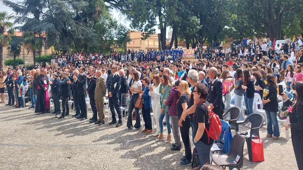 Nella Villa Fava, dopo il corteo che con in testa il gonfalone comunale e il sindaco Roy Biasi si è snodato da piazza Duomo, si sono radunati scolari e studenti dei 3 istituti cittadini, per quella che il vescovo Giuseppe Alberti ha definito «una splendida mattinata di impegno e di festa».