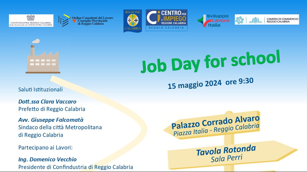 Il 15 maggio 2024 ore 9.30 si terrà presso Palazzo Alvaro a Reggio Calabria il JOB DAY FOR SCHOOL, evento conclusivo della seconda edizione del progetto “Insieme creiamo il futuro”, promosso dalla partnership tra Centro per l’impiego di Reggio Calabria con il Responsabile Ing. Vittorio Colosimo - Sviluppo Lavoro Italia (ex ANPAL servizi SpA) con Filippo Francica, 9 Scuole reggine che coprono il territorio di competenza territoriale da Bagnara Calabra a Bova Marina, insieme a Confindustria della provincia Reggio Calabria, Ordine dei Consulenti del Lavoro della provincia Reggio Calabria, Camera di Commercio di Reggio Calabria e oltre 35 Aziende.