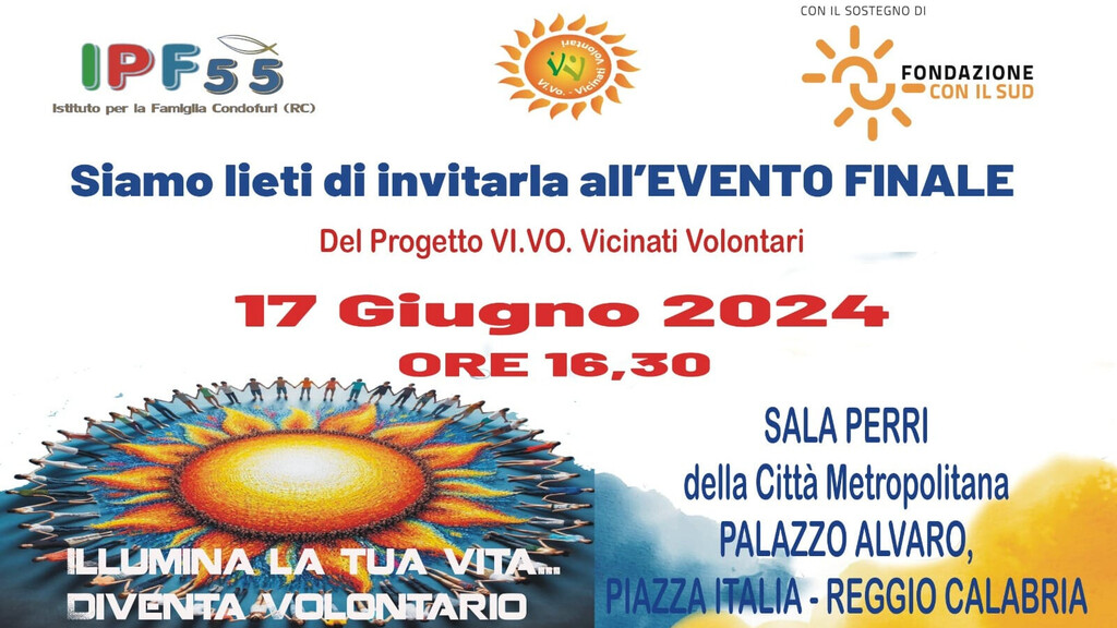 L’Istituto per la famiglia sezione 55 (Condofuri-RC) annuncia la Conferenza Stampa del progetto “VI.VO”- VICINATI VOLONTARI sostenuto dalla Fondazione CON IL SUD” con l’evento che si terrà il 17 giugno 2024 alle ore 16,30 nella sala Perri della Città Metropolitana, Palazzo Alvaro-Reggio Calabria. Con soddisfazione il capofila e i partners raccontano il lungo percorso attraverso la voce degli operatori, dei volontari e dei beneficiari che hanno profuso impegno e dedizione disinteressata. Il progetto, risultato tra le migliori idee innovative e tra le 4 vincitrici per la Regione Calabria, in risposta al Bando Volontariato 2019, il cui scopo è far rinascere le aree interne del Sud Italia, ha avuto la durata di 36 mesi ed ha inteso contrastare la condizione di disagio, esclusione sociale ed isolamento territoriale delle famiglie in difficoltà e persone fragili (oltre 1.000 utenti raggiunti) residenti nei comuni di Bagnara Calabra, Condofuri, Bruzzano Zeffirio, Molochio e zone limitrofe.