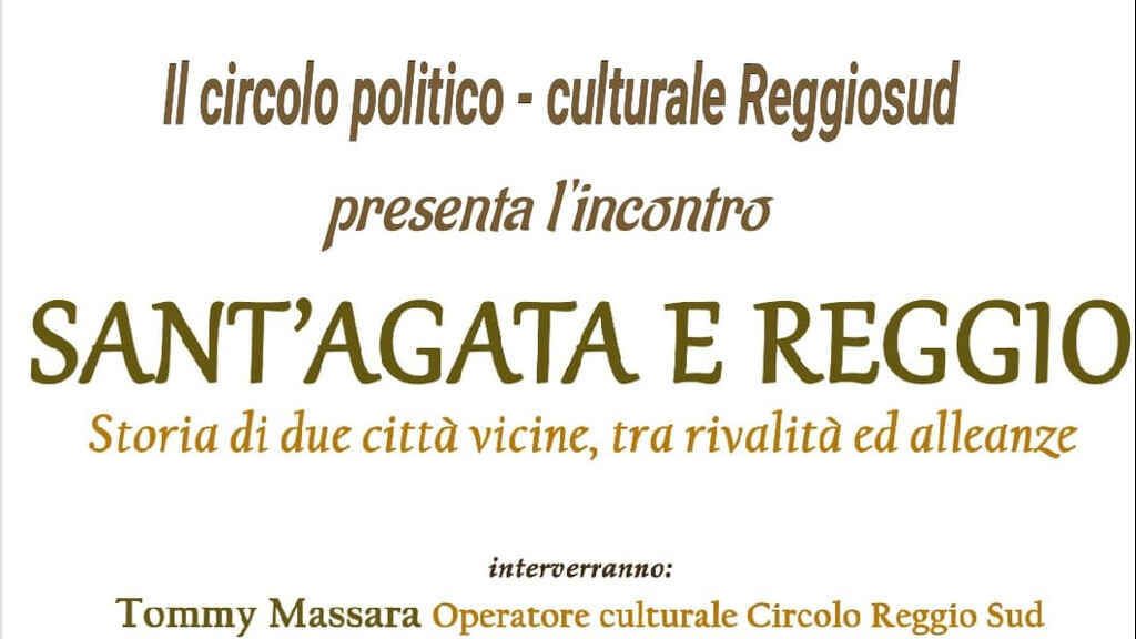 "Sant’Agata e Reggio. Storia di due città vicine, tra rivalità e alleanze", questo il titolo dell’incontro che si terrà mercoledì 26 giugno, ore 19, presso il Circolo Reggio Sud e che vedrà come relatori: Tommy Massara, operatore culturale, Circolo Reggio Sud, Valeria Varà, funzionario architetto del Ministero della Cultura e Orlando Sorgonà, docente di discipline umanistiche e storico.