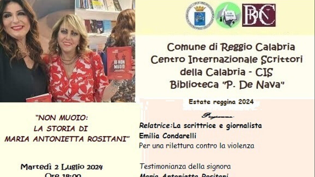 Prendono il via gli appuntamenti organizzati dal Centro Internazionale Scrittori della Calabria, in sinergia con il comune di Reggio Calabria, nell’ambito dell’Estate reggina 2024. Martedì 2 luglio 2023, alle ore 18:00, presso la Biblioteca Villetta “P. De Nava”, si svolgerà la conferenza “Non muoio: la storia di Maria Antonietta Rositani” raccontata dalla scrittrice e giornalista Emilia Condarelli, per una riflessione contro la violenza.