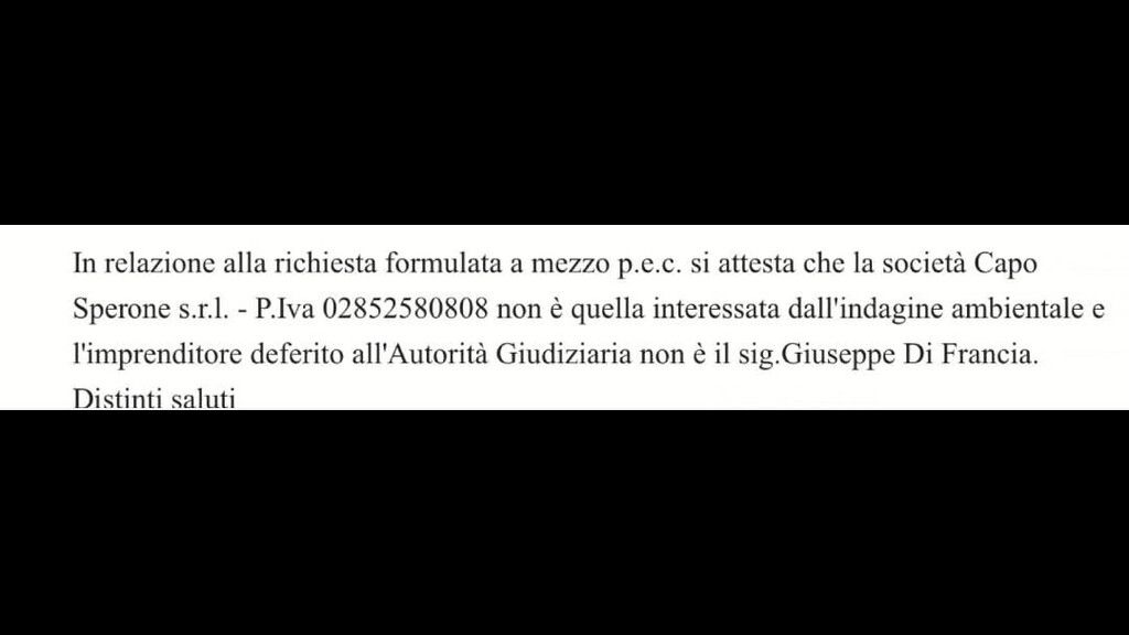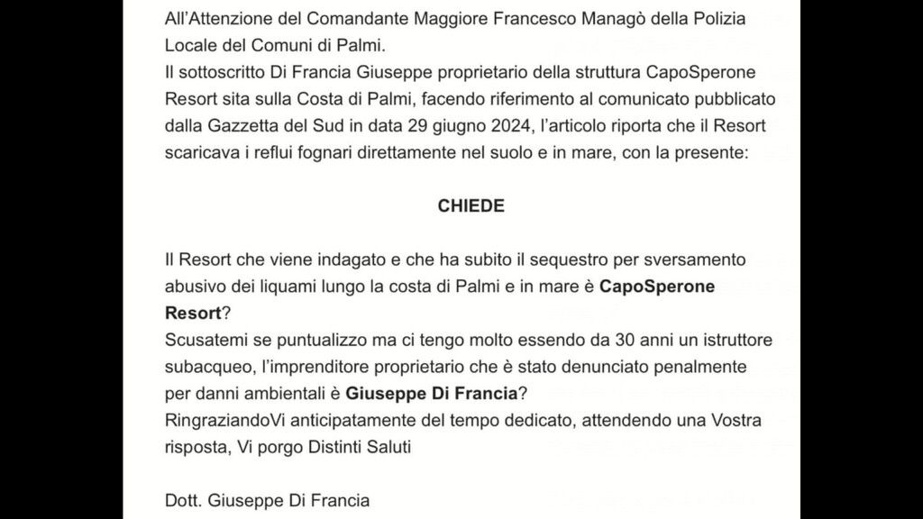 Inoltre, come da foto che si allega, la Polizia Locale di Palmi, in persona del Comandante, Magg. Dr. Francesco Managò chiarisce "che la società CapoSperone Resort non è quella interessata all'indagine e l'imprenditore deferito all'Autorità Giudiziaria non è il Sig. Giuseppe Di Francia", come riporta il contenuto della pec.