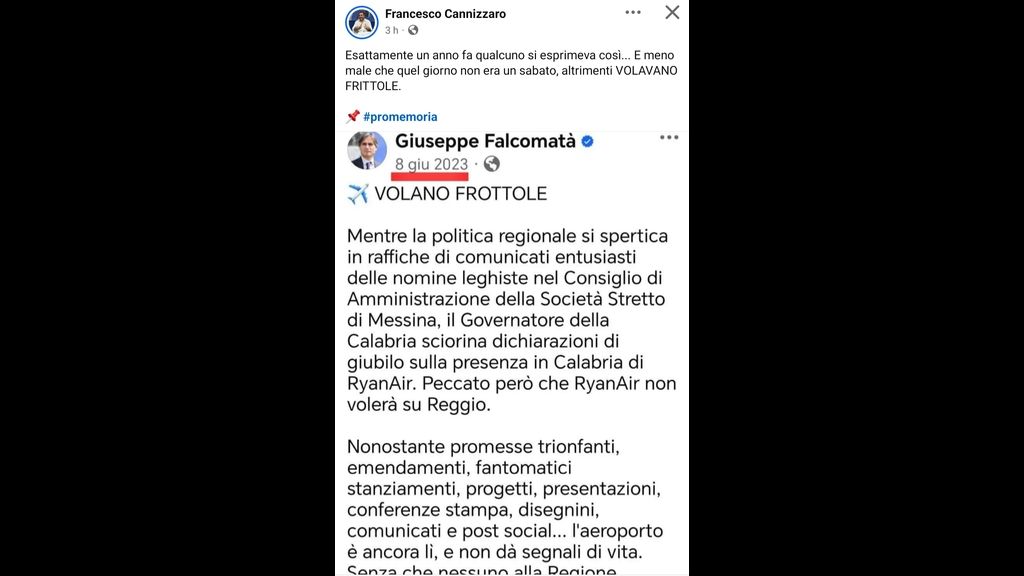 Oggi, a distanza di quasi un anno e con Ryanair base operativa in cittá, il deputato reggino di Forza Italia Francesco Cannizzaro ha repostato le famose parole di Falcomatá, aggiungendo, goliardicamente: