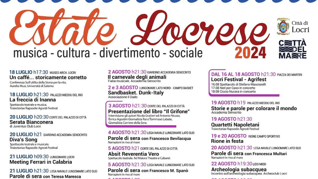 Dopo l'enorme successo del Giugno Locrese che ha visto la città ospitare il grande attore italiano Giancarlo Giannini, luglio è il mese della cultura, con incontri al parco archeologico e al Museo del territorio, eventi con la Direzione dei Musei e l'Archeoclub di Locri, presentazioni di libri, l'Opera musica festival, le attività ludico ricreative con i centri estivi e ludoteche, i saggi e spettacoli di danza, laboratori musicali ed esibizioni con l'Accademia Senocrito. Arriva il clou dell'estate e sarà un agosto tutto da vivere, guardando al programma che l'Amministrazione comunale guidata dal sindaco Giuseppe Fontana presenta per regalare serate indimenticabili ai cittadini e a chi deciderà di raggiungere Locri per trascorrere le vacanze.