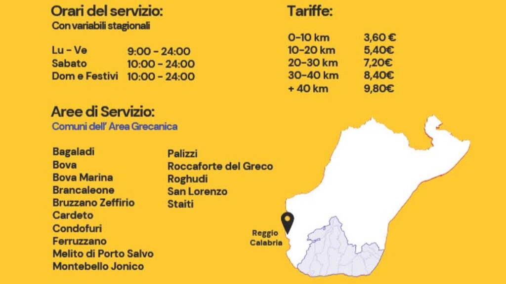 I costi variano dai 3,60 euro per distanze fino a 10 chilometri a 9,80 euro per tragitti superiori ai 40 chilometri. Le aree di servizio individuate ricadono nei Comuni di Bagaladi, Bova, Bova Marina, Brancaleone, Bruzzano Zeffirio, Cardeto, Condofuri, Ferruzzano, Melito di Porto Salvo, Montebello Jonico, Palizzi, Roccaforte del Greco, Roghudi, San Lorenzo e Staiti. Da qui, dunque, si potranno facilmente raggiungere i punti di interesse del territorio come stazioni ferroviarie, ospedali e poliambulatori, uffici postali, spiagge e molti altri ancora.