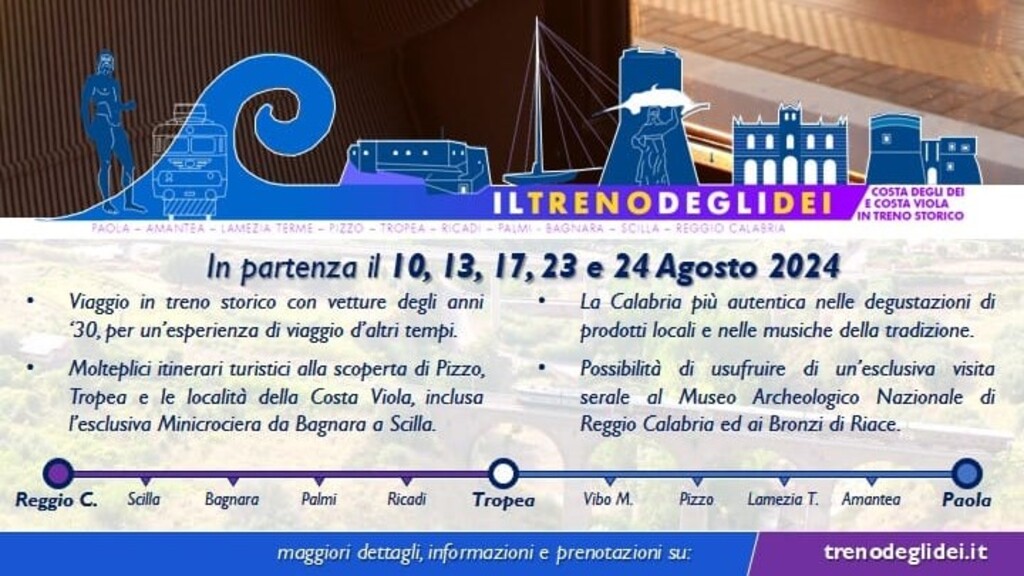 Torna anche quest'anno, grazie al sostegno della Regione Calabria, in partnership con FS Treni Turistici Italiani, Fondazione FS Italiane e Associazione Ferrovie in Calabria, l'imperdibile appuntamento con Il Treno degli Dei, l'affascinante treno storico di Fondazione FS Italiane, che nelle date del 10, 13, 17, 23 e 24 agosto, darà spettacolo e farà emozionare sulla Ferrovia Tirrenica Meridionale da Paola a Reggio Calabria Centrale, passando per Tropea.