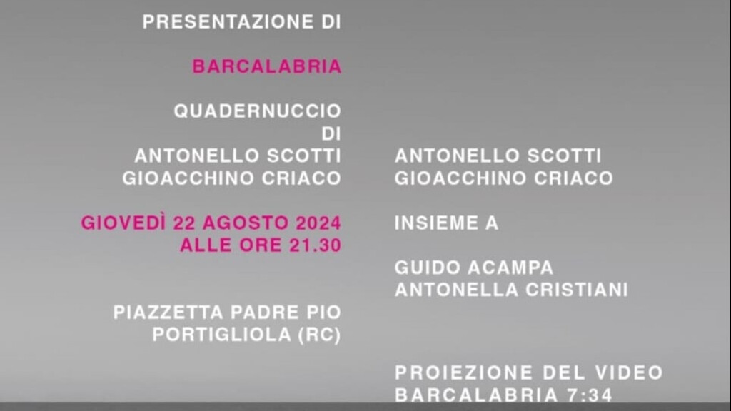 Giovedì 22 agosto 2024, alle ore 21.30, in Piazzetta Padre Pio, a Portigliola, si terrà la presentazione di “Barcalabria”, quadernuccio di Antonello Scotti e Gioacchino Criaco, tra immagini e parole, stampato in soli quindici esemplari, omaggio alla Calabria ionica, con Locri Epizephiri e la Bovesìa tutta. Sarà inoltre proiettato il video “Barcalabria 7:34”.