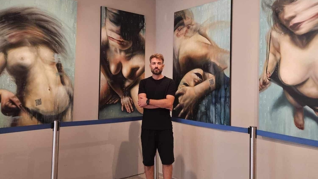La mostra è incentrata sulla rappresentazione del corpo femminile, che attraverso la pittura diventa mezzo per indagare sulla condizione esistenziale dell’essere umano all’interno della società contemporanea, liquida e ormai priva di qualsiasi certezza, dalla quale si cerca sempre più una via di fuga dalla realtà attraverso la tecnologia digitale. Il titolo della mostra è un chiaro riferimento al concetto di società liquida ideato dal sociologo Zygmunt Bauman. La metafora della liquidità, da quando Bauman l’ha coniata, ha segnato i nostri anni ed è entrata nel linguaggio comune per descrivere la modernità in cui viviamo: individualizzata, privatizzata, incerta, flessibile, vulnerabile, nella quale a una libertà senza precedenti fanno da contraltare una gioia ambigua e un desiderio impossibile da saziare. I dipinti sono caratterizzati dall’utilizzo dello sfocato che diventa un vero e proprio strumento espressivo. I volti rappresentati appaiono quasi smaterializzati dall’effetto mosso. I corpi sono sempre isolati e immersi in atmosfere scandite da un algoritmo, una serie di combinazioni numeriche formate dalle cifre 0 e 1 del codice binario sul quale si basa il linguaggio informatico.