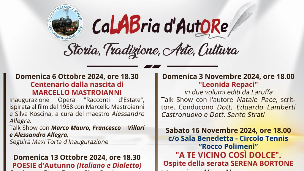 La sala del piccolo Museo FS "Pietro Germi" dell'associazione "Incontriamoci Sempre ODV" sarà l'agorà della Rassegna Culturale Calabria d'autore per la stagione autunnale invernale e primaverile 2024/2025. Con orario fissato alle 18,3O, domenica 6 ottobre, si inizia con il classico format domenicale, che si apre con l'inaugurazione dell'opera del Maestro Alessandro Allegra, uno dei più grandi attori del 900, Marcello Mastroianni, proprio nel centenario dalla nascita (1924 /2024) e per l'occasione si parlerà del suo capolavoro, "Racconti d'estate" del 1958, che ha ispirato l'opera del maestro Allegra, di questo bellissimo film. A moderare l'incontro saranno Marco Mauro e Francesco Villari. Finale dolce con la MaxiTorta Fragomeni.