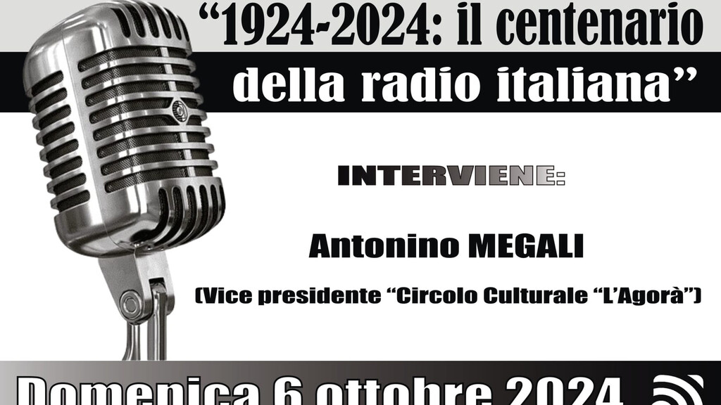 Domenica 6 ottobre il Circolo Culturale “L’Agorà” organizza la conversazione sul tema “1924-2024: il centenario della radio italiana”. La Radio italiana compie 100 anni. Il 6 gennaio del 1924 è una data da ricordare proprio perché partirono le prime trasmissioni della radio italiana che entrerà ufficialmente nella società italiana. Alle 21:00 del 6 ottobre 1924, esattamente 100 anni fa, ci fu la prima trasmissione radiofonica via etere in Italia. La trasmissione prevedeva un concerto di musica operistica, un bollettino meteo e le notizie della borsa, tutto annunciato dalla voce di Ines Viviani Donarelli.