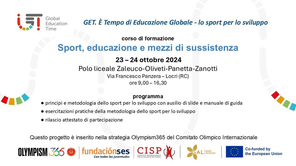 Inizia la prossima settimana “GET-È Tempo di Educazione Globale”, evento promosso dal CISP di Roma, in partenariato con il Gal Terre Locridee, che si svolgerà nella Locride nei prossimi mesi, concentrandosi sullo “sport per lo sviluppo”. L’iniziativa è inserita sia nell’omonimo progetto che coinvolge 8 paesi, con il sostegno dell’Unione Europea, sia nella strategia del Comitato Olimpico Internazionale “Olympism 365”, con il sostegno della Fundación SES (Argentina).
