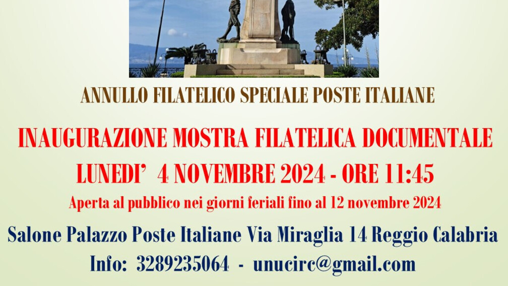 La Sezione provinciale di Reggio Calabria dell’ U.N.U.C.I. - Unione Nazionale Ufficiali in Congedo d’Italia, presieduta da Nicola Pavone insieme al Gruppo Filatelico Numismatico U.N.U.C.I. Reggio Calabria, presieduto da Pietro Cavò ha organizzato una mostra filatelica documentale sulla “Giornata dell’Unità nazionale e delle Forze armate” presso il salone di Poste italiane di via Miraglia 14, che sarà inaugurata il 4 novembre 2024 alle ore 11:45 da S. E. il  Prefetto di Reggio Calabria al termine della cerimonia istituzionale che si svolgerà a Piazza Italia.
