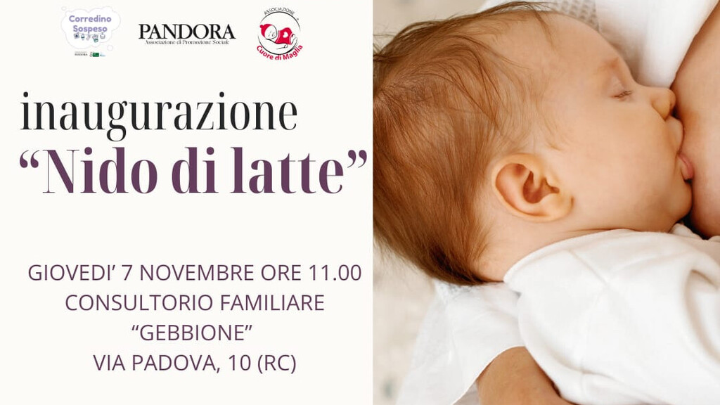 Il prossimo 7 novembre alle ore 11.00, presso il Consultorio Familiare “Gebbione” di Reggio Calabria dell’ASP di Reggio Calabria verrà inaugurato “Nido di latte” uno spazio destinato ai genitori e bimbi per il momento dell’allattamento, del cambio pannolino, del gioco e della lettura.