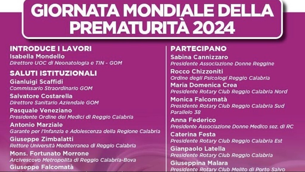 Sono stati invitati a relazionare i massimi esperti del settore, il Presidente Nazionale della Società Italiana di Neonatologia Prof. Massimo Agosti e la Presidente Nazionale dell’Associazione Genitori VIVERE Onlus Avvocato Martina Bruscagnin oltre al Direttore della Neonatologia e Terapia Intensiva Neonatale del GOM dott.ssa Isabella Mondello ed al Presidente dell’associazione genitori ERACLE ODV di Reggio Calabria.