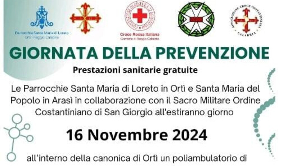 Sabato 16 novembre 2024, dalle ore 9:00 alle 12:30, si terrà una giornata Costantiniana di visite mediche gratuite presso i locali parrocchiali di Ortì, dedicata alle persone bisognose del territorio. L’iniziativa è promossa dal Sacro Militare Ordine Costantiniano di San Giorgio-Sezione di Reggio Calabria in collaborazione con le comunità parrocchiali di Ortì e Arasì, la Croce Rossa Italiana-Sezione di Reggio Calabria, l'Associazione Volontari Ospedalieri, l'Associazione Croce Costantiniana e l'Associazione ANIOC di Reggio Calabria.