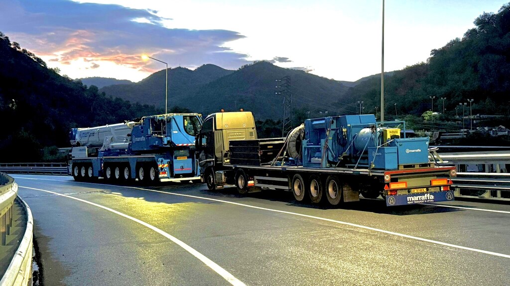 Tale impalcato metallico finale, più leggero, robusto e duraturo di un simile elemento in cemento armato convenzionale, verrà applicato con l’impiego dell’imponente gru in foto, appena trasportata nell’area di cantiere corrispondente e dotata di massicci contrappesi, caricati su ben 6 autotreni aggiuntivi.