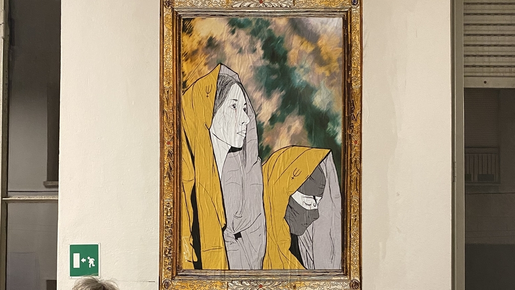 A Reggio Calabria, l’azione artistica si è intrecciata con la mostra antologica dedicata alla fotografa Letizia Battaglia. In questo contesto, LBS ha presentato una reinterpretazione di una fotografia iconica della Battaglia, un’immagine che non è esposta nella mostra, ampliando così il dialogo sull’eredità culturale e sociale dell’artista siciliana nella città reggina. L’opera, con i suoi forti richiami visivi e simbolici, rappresenta due figure femminili avvolte in mantelli dorati e segnate da lacrime di sangue, evocando il dolore, ma anche la forza e la resilienza delle donne vittime di violenza.