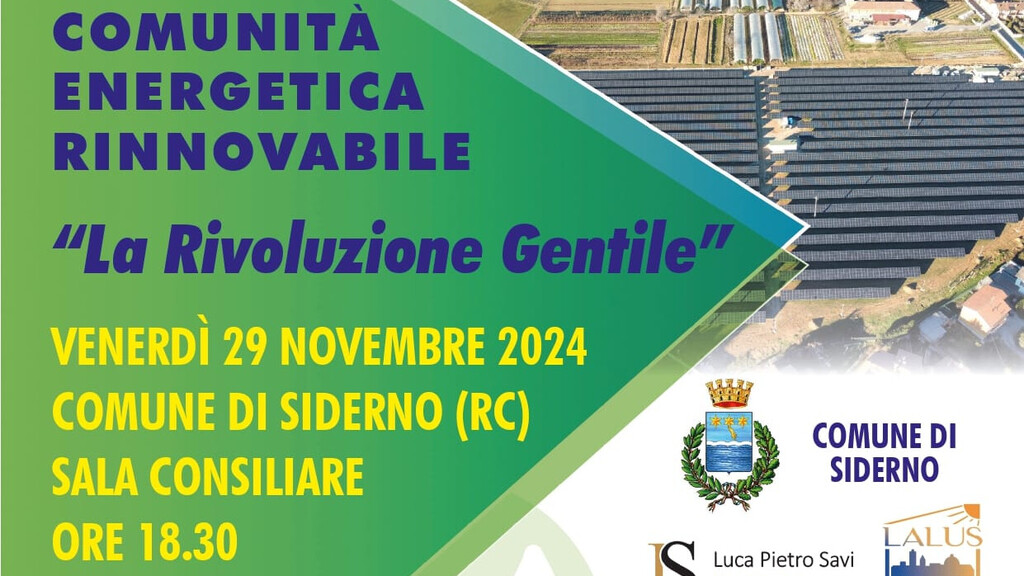 L’inizio della “Rivoluzione Gentile”. Venerdì 29 novembre alle 18:30, nella sala consiliare del Comune di Siderno avrà luogo l’incontro finalizzato alla creazione di una Comunità Energetica Rinnovabile. Si tratta di un’associazione tra cittadini, imprese, attività commerciali e pubbliche amministrazioni che decidono di unire le proprie forze al fine di produrre e consumare energia da fonti rinnovabili su scala locale, con benefici economici, ambientali e sociali per tutti gli aderenti.