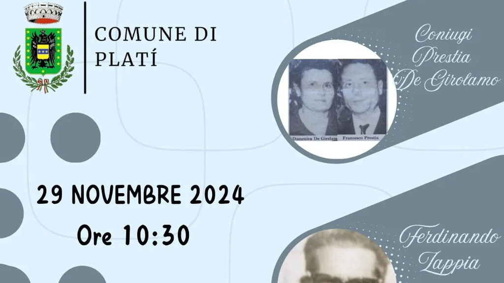 Domani 29 novembre 2024, alle ore 10:30, il Comune di Platì celebrerà la giornata che per la Comunità rappresenta una evento di particolare rilevanza, con la cerimonia di intitolazione di alcune vie, larghi e piazzali cittadini a personalità che hanno lasciato un segno nella storia del territorio Platiese e non solo. L’evento avrà inizio presso il Palazzo Municipale in Piazza Domenico Demaio, 13, alla presenza  di numerose personalità politiche, civili, militari e religiose tra i quali i Familiari dei personaggi destinatari dell’intitolazione, della scuola guidata dall’instancabile Dirigente Scolastico Prof.ssa Daniela Perrone, del Presidente dell’Associazione "I Care" Prof. Vito Pirruccio, del Vice Presidente Anpi Pino Zappavigna, del Vescovo della Diocesi Locri–Gerace Mons. Francesco Oliva, del Presidente dell’Assocomuni Sindaco di Bovalino Vincenzo Maesano accompagnato dai Sindaci del Comprensorio, del Consigliere Regionale On. Giovanni Muraca , del Sindaco della Città Metropolitana Giuseppe Falcomatà,  del Presidente del Consiglio Comunale Paolo Ferrara e del  Sindaco Rosario Sergi, che guideranno i cittadini in un momento di profonda memoria collettiva.