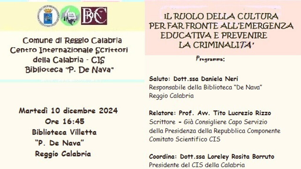 “Il ruolo della cultura per far fronte all’emergenza educativa e prevedere la criminalità” è il titolo dell’incontro promosso dal Centro Internazionale Scrittori della Calabria, con il patrocinio del comune di Reggio Calabria che si svolgerà martedì 10 Dicembre 2024, alle ore 16:45 nella Sala conferenze della Biblioteca villetta “P. De Nava” di Reggio Calabria.