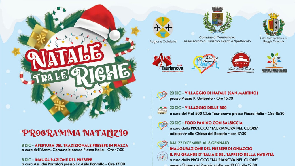 Dall’8 Dicembre al 6 Gennaio, è un programma più fitto che mai quello varato dall’amministrazione comunale con il titolo “Natale tra le Righe”. Un cartellone che, nell’anno di Taurianova Capitale del Libro 2024, si muove in diversi appuntamenti direttamente con l’impulso verso la promozione della cultura che deriva dal ruolo nazionale, che diventa ora ancora più conosciuto e apprezzato grazie alle attività attrattive che la città esprime nel clima natalizio.