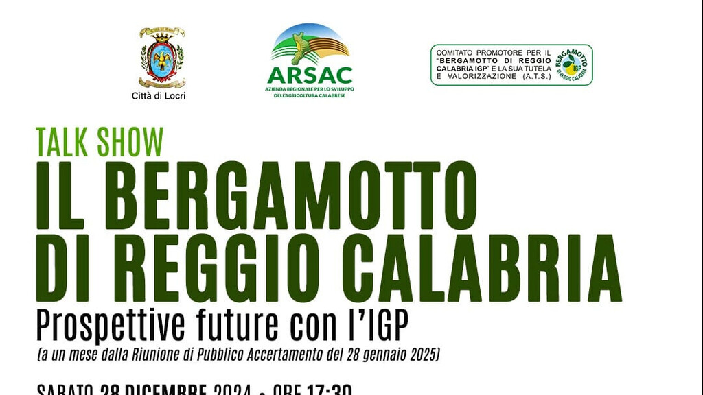 E proprio a un mese dalla prossima importante riunione ufficiale, si terrà sabato 28 dicembre 2024 alle 17,30 a Locri presso l'aula del consiglio comunale il talk show "Il Bergamotto di Reggio Calabria: prospettive future con l'IGP" organizzato dalla Città di Locri nell'ambito delle manifestazioni di promozione e valorizzazione delle filiere agricole e agroalimentari di eccellenza sostenute dall'ARSAC. Gli ospiti del talk saranno l'agronomo Rosario Previtera, presidente del Comitato Promotore per il Bergamotto di Reggio Calabria IGP e la sua tutela e valorizzazione (ATS), il prof. Filippo Arillotta autore del libro Storia fantastica del bergamotto di Reggio Calabria (Kaleidon editrice), Giuseppe Falcone tecnico e coordinatore del Comitato dei bergamotticoltori reggini, lon. Denis Nesci parlamentare europeo e membro, tra le altre, della “Commissione per lo sviluppo regionale.
