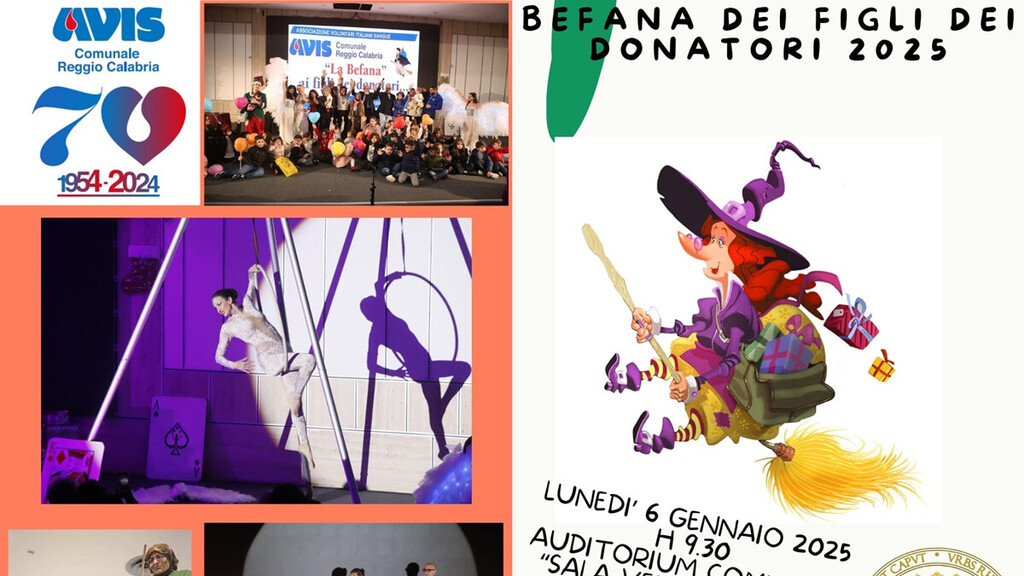 Torna l'appuntamento con la speciale Befana dell'Avis per le figlie e i figli di coloro che, donando il sangue presso l’unità di raccolta di Reggio Calabria, contribuiscono alla buona sanità e tengono viva la speranza. Tutto è pronto per lo spettacolo di magia e clownerie, dedicato alle piccole e ai piccoli nati tra il primo Gennaio 2017 e il 31 dicembre 2024, a cura della compagnia Giocolereggio, che si avvarrà per l’occasione anche della partecipazione di due artisti della celebre famiglia circense Orfei.