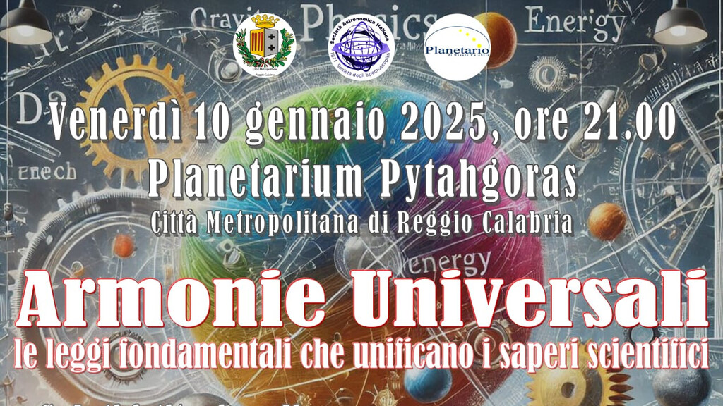 Venerdì 10 gennaio 2025 ore 21.00 presso il Planetarium Pythagoras della Città Metropolitana di Reggio Calabria si svolgerà un incontro con Domenico Marino, professore di Politica Economica presso l’Università Mediterranea di Reggio Calabria, su: “Armonie universali: le leggi fondamentali che unificano i saperi scientifici”.