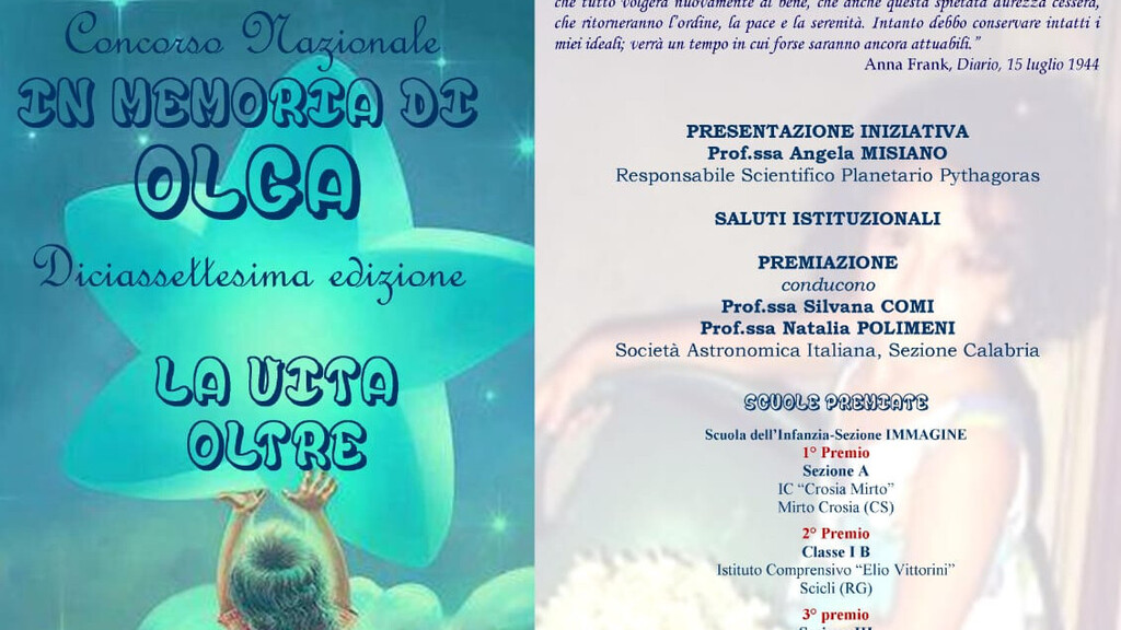 Il concorso, fortemente, voluto dalla Città Metropolitana di Reggio Calabria fin dal maggio 2008, per ricordare la bambina, reggina, Olga Panuccio, tragicamente scomparsa assieme ai genitori, è inserito, nelle more del rinnovo, nel Protocollo d'Intesa tra il Ministero dell’Istruzione e del Merito-Direzione generale per gli ordinamenti scolastici, la formazione del personale scolastico e la valutazione del sistema nazionale di istruzione, e la Società Astronomica Italiana.