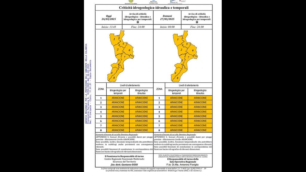 La Protezione Civile della Calabria ha diffuso per la giornata di oggi 26 Marzo e domani, Giovedì 27 Marzo, un bollettino di Allerta Meteo di colore arancione su tutta la Regione.
