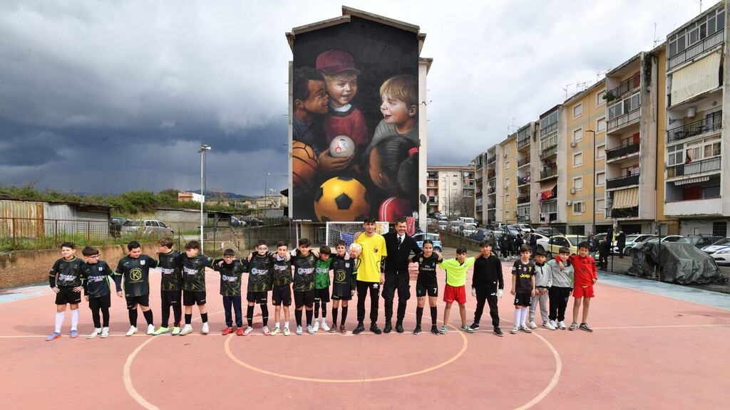 Bimbi di ogni etnia, intenti a maneggiare una palla che sembra una perla, con impresso il simbolo scelto dalla Città per rappresentare la candidatura di Reggio Calabria “Cuore del Mediterraneo” quale capitale italiana della cultura 2027. Una scena iconica, di complicità e benessere, che si sviluppa intorno ad altri giochi che raccontano l’evoluzione dello sport negli ultimi 50 anni. Così, lo street-artist Giulio Rosk ha scelto di rappresentare il contrasto ad ogni forma di razzismo nel murales inaugurato ad Arghillà e commissionato dalla Città Metropolitana in occasione della “Giornata internazionale per l’eliminazione della discriminazione razziale”.