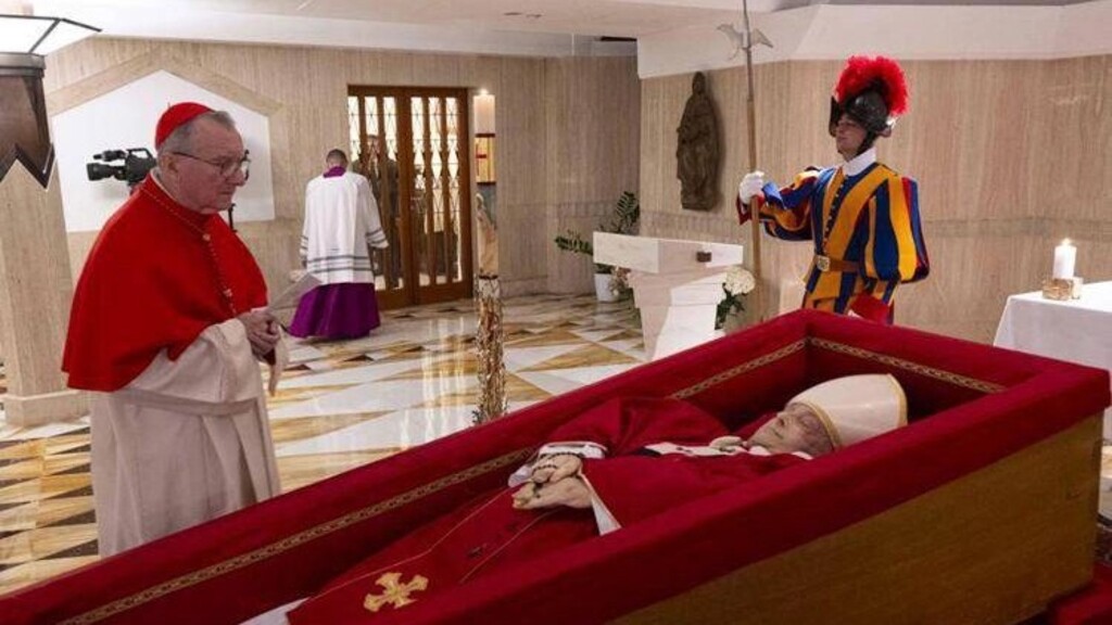 Diffusa oggi sui social la prima immagine della salma di Papa Francesco, morto ieri all'età di 88 anni. Il Pontefice, in una semplice bara di legno, indossa la mitra, un rosario tra le mani, la veste liturgica rossa. Accanto al feretro, il cardinale Pietro Parolin, raccolto in preghiera.