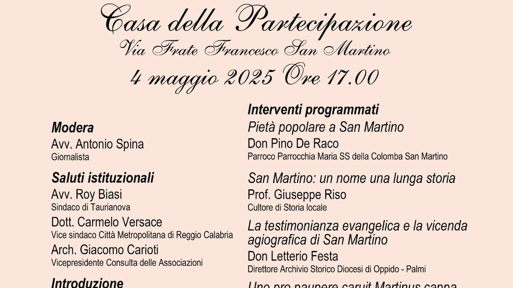 Su questa direzione si inserisce il Convegno “Sulla Via di Martino – l’uomo, il santo, il culto” che si terrà Domenica 4 Maggio alle ore 17.00 presso la Casa della Partecipazione di San Martino, moderato dal giornalista Avv. Antonio Spina e che si aprirà con i saluti istituzionali del Sindaco di Taurianova Avv. Roy Biasi, del Vice Sindaco della Città Metropolitana di Reggio Calabria Dott. Carmelo Versace e del Vicepresidente della Consulta delle Associazioni Arch. Giacomo Carioti.