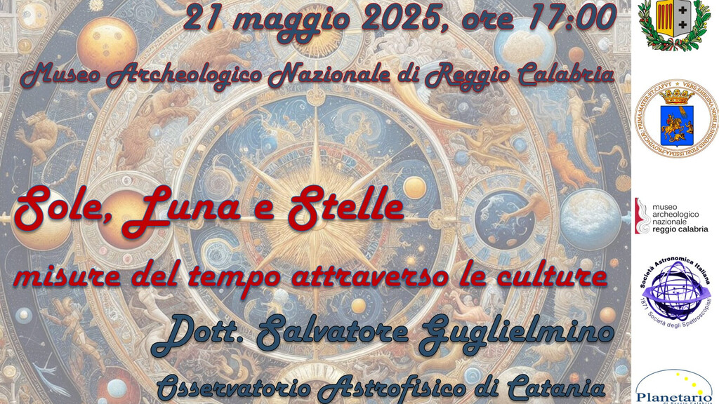 In occasione della Giornata Mondiale della Diversità Culturale, mercoledì 21 maggio 2025 alle ore 17.30, su iniziativa del Planetarium Pythagoras della Città Metropolitana di Reggio Calabria, il Museo Archeologico Nazionale di Reggio Calabria ospiterà, nella sala conferenze, l’incontro dal titolo “Sole, Luna e Stelle: misure del tempo attraverso le culture” con relatore il Dott. Salvo Guglielmino, primo ricercatore dell’INAF – Osservatorio Astrofisico di Catania.