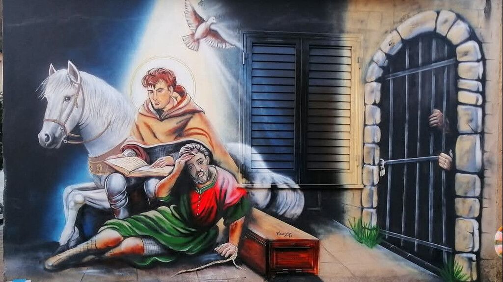 Il murale n.4 intitolato "Rinuncia alle armi", si distingue per un'efficace attualizzazione del tema di San Martino, capace di rendere il messaggio di solidarietà immediato e vicino alla sensibilità contemporanea. La comunicazione visiva è chiara ed emotivamente coinvolgente. Pur con una tecnica ancora essenziale e un’integrazione ambientale limitata, l’opera dimostra una buona aderenza narrativa e un’intenzione significativa di reinterpretare la tradizione in chiave moderna.