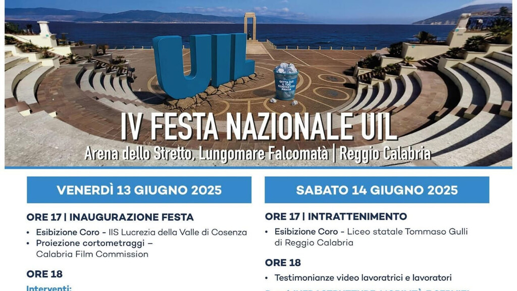 Tutto pronto per la quarta Festa nazionale della Uil, che quest’anno avrà come straordinario palcoscenico la maestosa Arena dello Stretto, sul Lungomare Falcomatà di Reggio Calabria. Venerdì 13 e sabato 14 giugno, il cuore del Sud si trasformerà in un grande laboratorio di idee, riflessioni e proposte, in cui il sindacato torna a essere protagonista attivo nel dibattito pubblico sul futuro del lavoro e del Mezzogiorno.