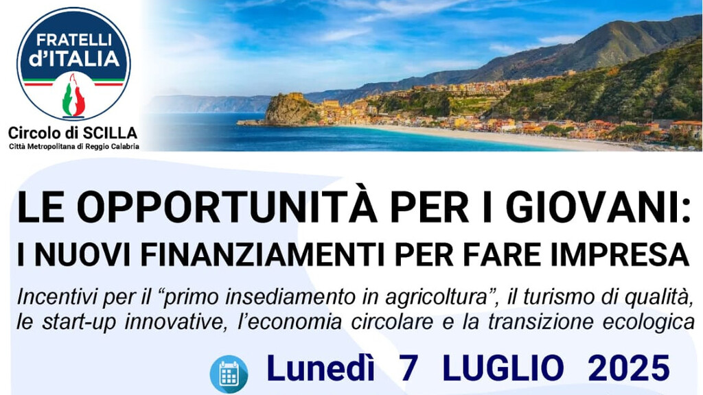 Lunedì 7 Luglio alle ore 18,00 nella Sala Consiliare del Palazzo Municipale di Scilla, si terrà il convegno promosso dal locale Circolo di Fratelli d’Italia, in collaborazione con la Federazione Provinciale, dal titolo: “Le opportunità per i giovani: i nuovi finanziamenti per fare impresa”.