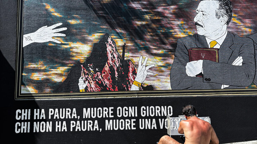 Il murale dell'artista Bruno Salvatore Latella raffigura Giovanni Falcone e Paolo Borsellino come guardiani della giustizia