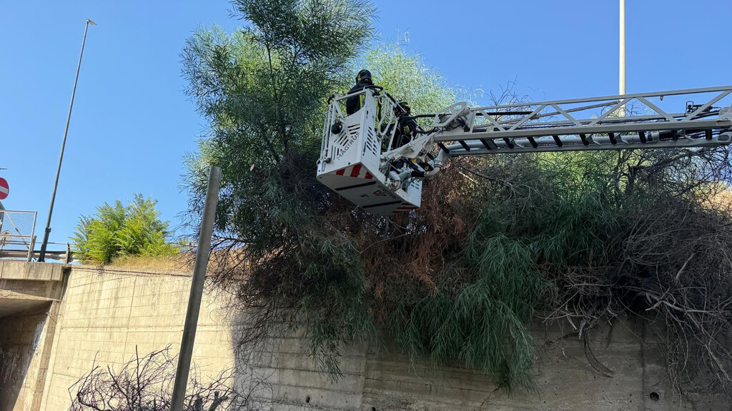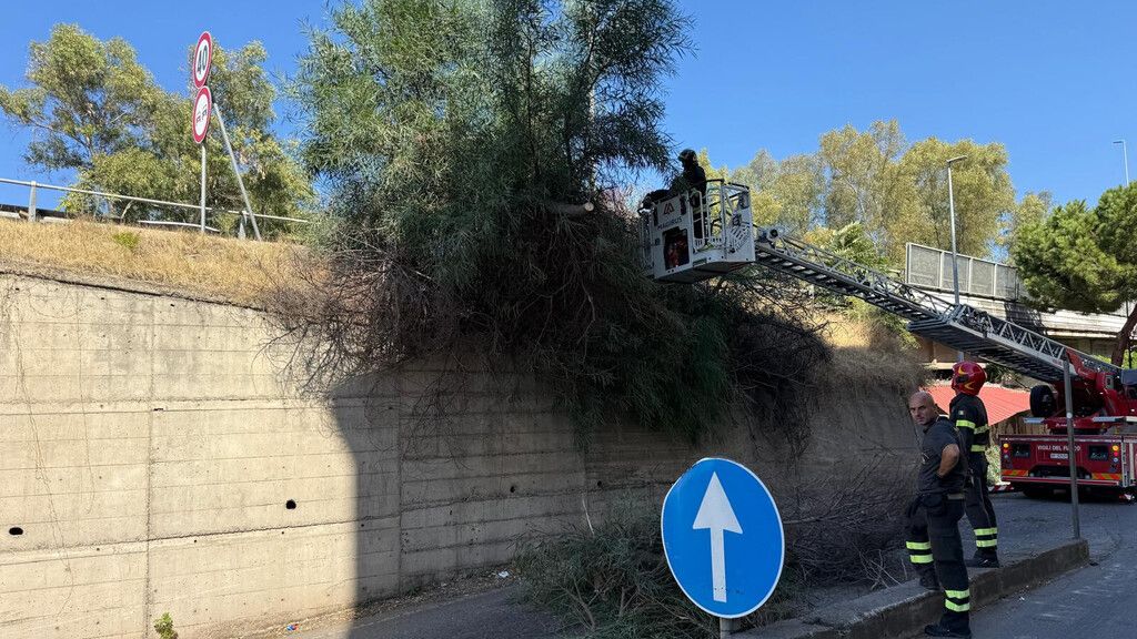 In corso un’operazione col carrello elevatore fra la rampa terminale della tangenziale di Santa Caterina lato nord  e l’inizio del viadotto sopraelevato SS740, quello che conduce alla A2 ed alla Ss106. L’intervento è proteso al taglio dei numerosi rami pericolosi che incombono sulla strada sottostante, molto trafficata.